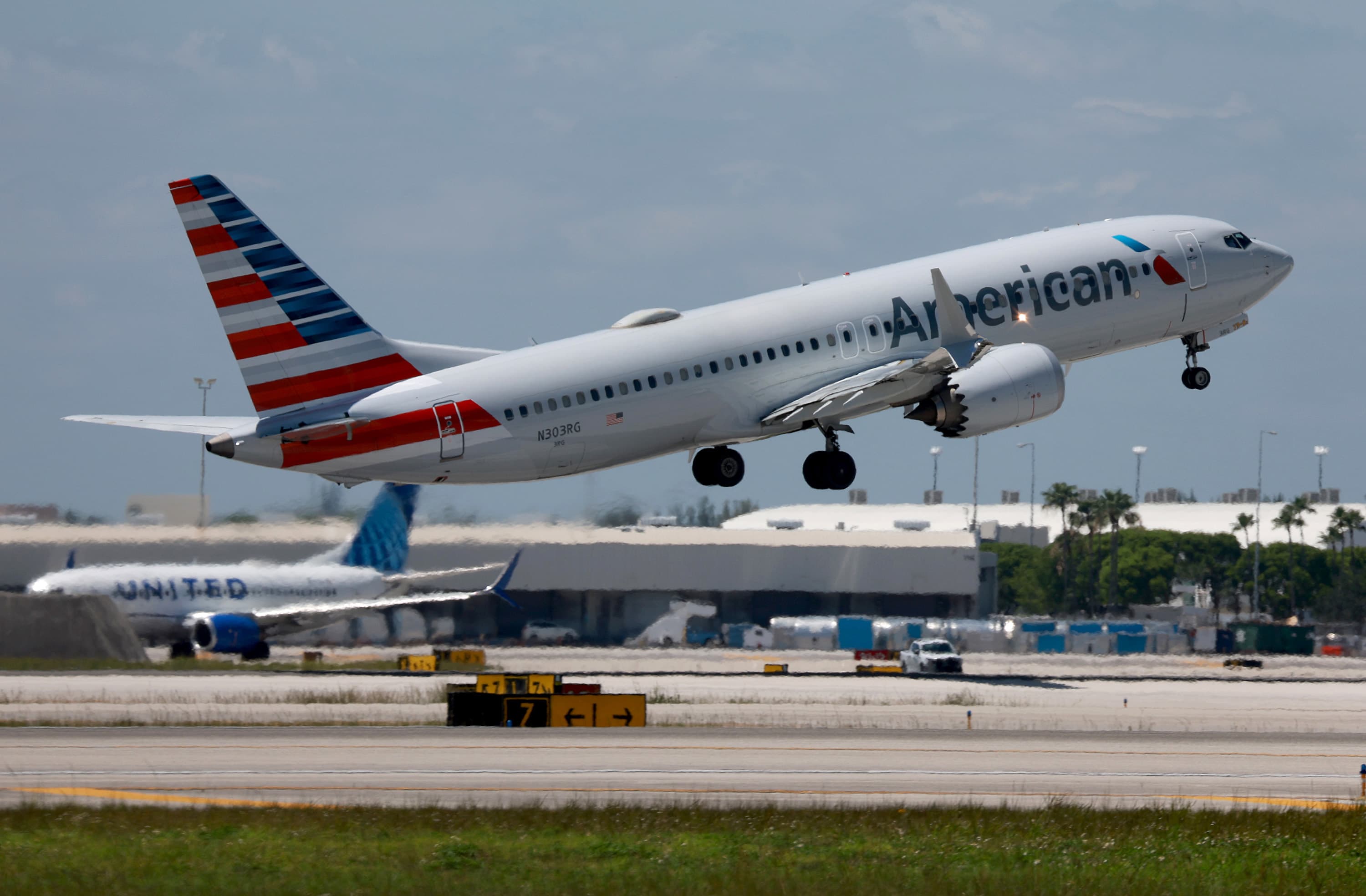 An American Airlines plane takes off from the Miami International Airport on May 02, 2023 in Miami, Florida.