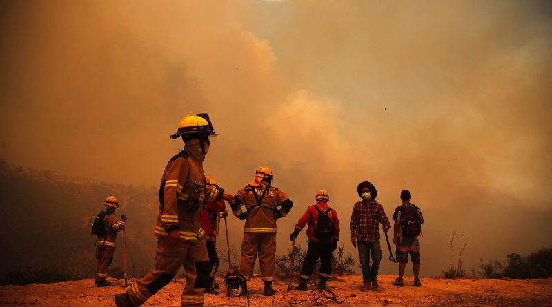 Firefighters work on the zone of a forest fire in the hills in Quilpue comune, Valparaiso region, Chile on February 3, 2024.