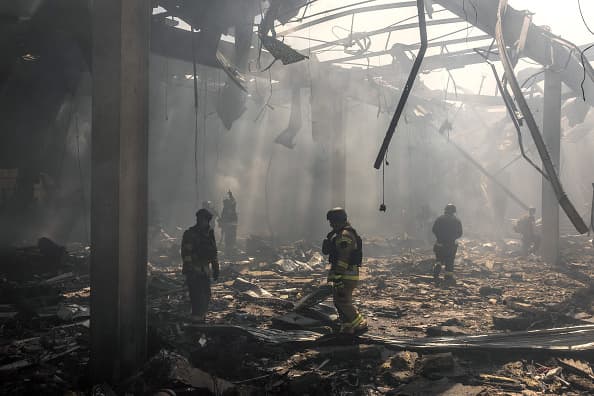 Ukrainian emergency and rescue personnel standing debris at the site of the destroyed supermarket following a Russian strike, in Kostyantynivka, eastern Donetsk region, on Aug. 9, 2024.