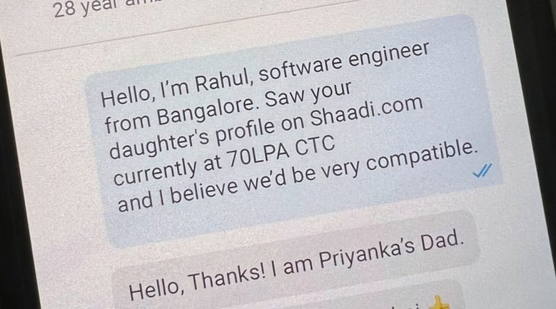ऐसा ही एक लड़के ने भी किया. उसे एक लड़की का प्रोफाइल पसंद आया होगा. इस वजह से उसने उस प्रोफाइल पर दिए नंबर पर मैसेज किया होगा. वो नंबर लड़की के पिता का निकला. चैट के हिसाब से लड़की का नाम प्रियंका पी है. जबकि लड़के का नाम राहुल है जो बेंगलुरु में सॉफ्टवेयर इंजीनियर है. लड़के ने लिखा कि उसने शादी डॉट कॉम पर लड़की का प्रोफाइल देखा, जो उसे अच्छा लगा. लड़की की सालाना सैलरी 70 लाख रुपये है. उसने कहा कि उसे लगता है दोनों काफी अच्छे मैच होंगे.