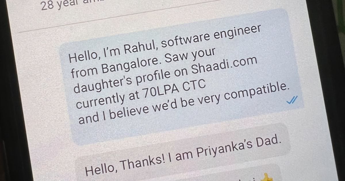 ऐसा ही एक लड़के ने भी किया. उसे एक लड़की का प्रोफाइल पसंद आया होगा. इस वजह से उसने उस प्रोफाइल पर दिए नंबर पर मैसेज किया होगा. वो नंबर लड़की के पिता का निकला. चैट के हिसाब से लड़की का नाम प्रियंका पी है. जबकि लड़के का नाम राहुल है जो बेंगलुरु में सॉफ्टवेयर इंजीनियर है. लड़के ने लिखा कि उसने शादी डॉट कॉम पर लड़की का प्रोफाइल देखा, जो उसे अच्छा लगा. लड़की की सालाना सैलरी 70 लाख रुपये है. उसने कहा कि उसे लगता है दोनों काफी अच्छे मैच होंगे.