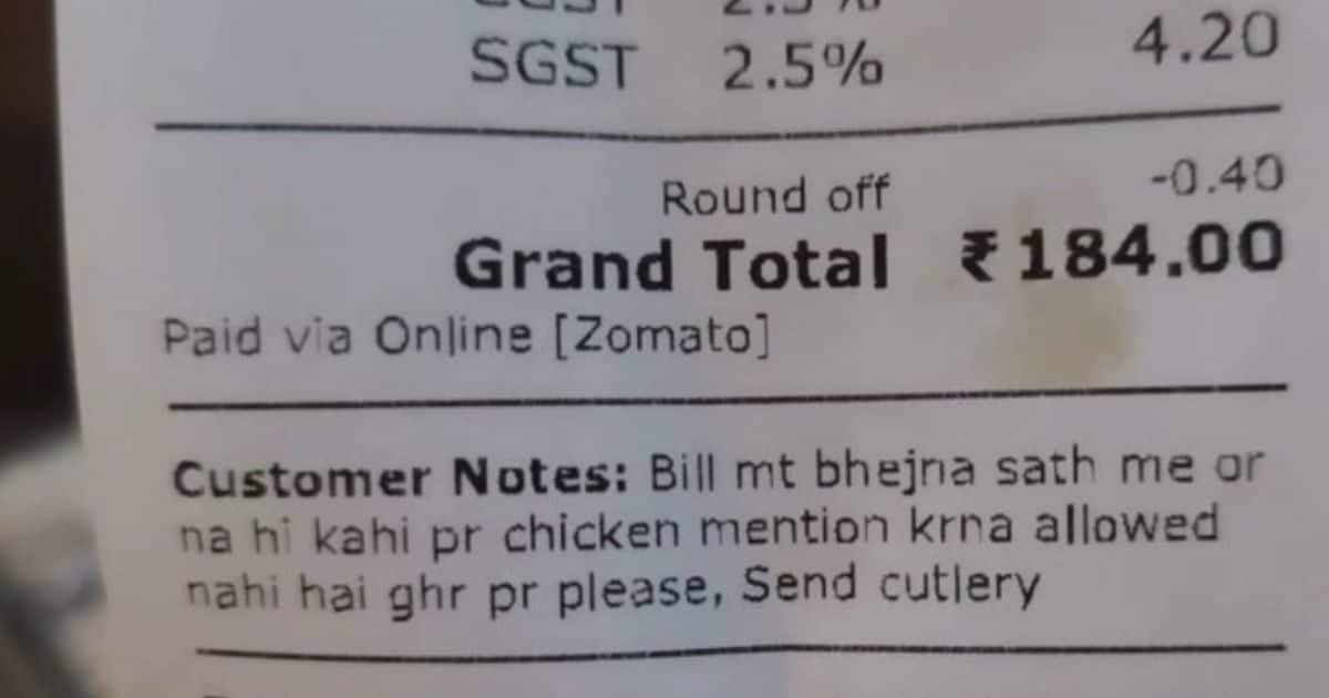 ‘बिल मत देना न ही चिकन लिखना कहीं ‘ ग्राहक ने की ऐसी रिक्वेस्ट, Zomato हैरान!