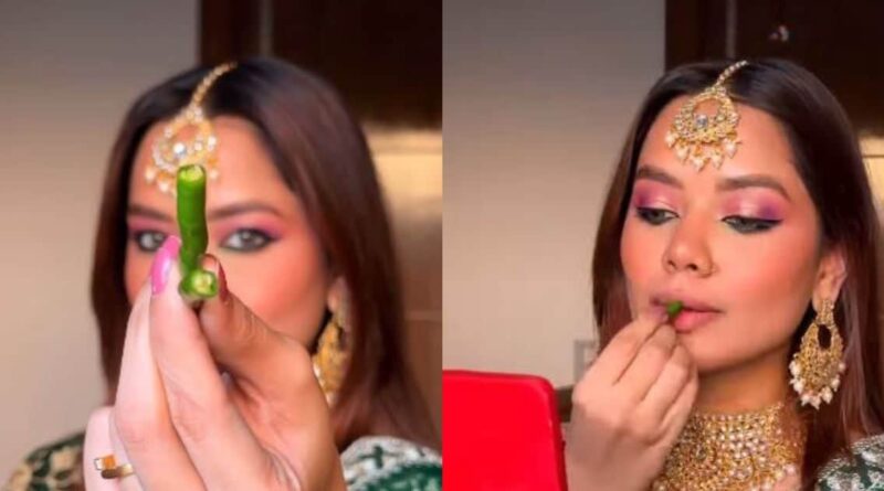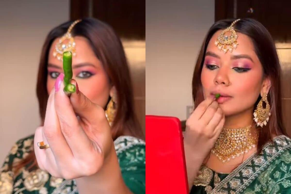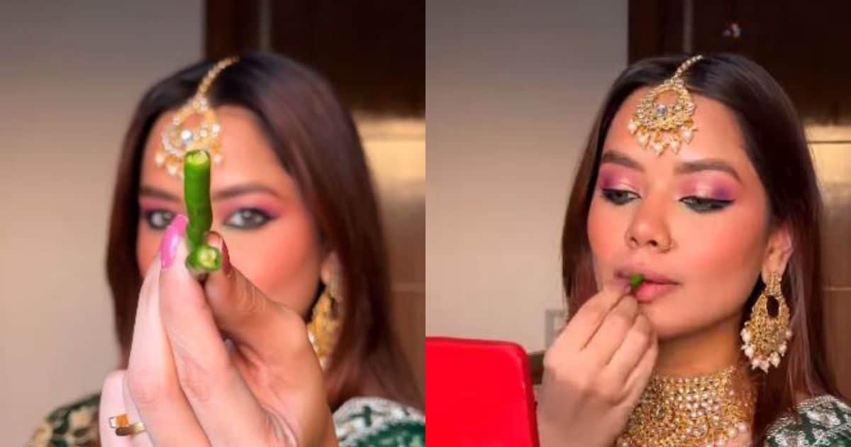 इंस्टाग्राम यूजर शुभांगी आनंद एक सोशल मीडिया इंफ्लुएंसर हैं जिनके 3 लाख से ज्यादा फॉलोअर्स हैं. वो स्टाइलिंग और फैशन से जुड़े वीडियोज पोस्ट करती हैं. हाल ही में उन्होंने एक वीडियो शेयर किया है जिसमें वो ट्रेडिशनल कपड़ों में तैयार हो रही हैं. चेहरे का मेकअप करते वक्त वो अपने होंठ पर हरी मिर्च रगड़ती नजर आ रही हैं.