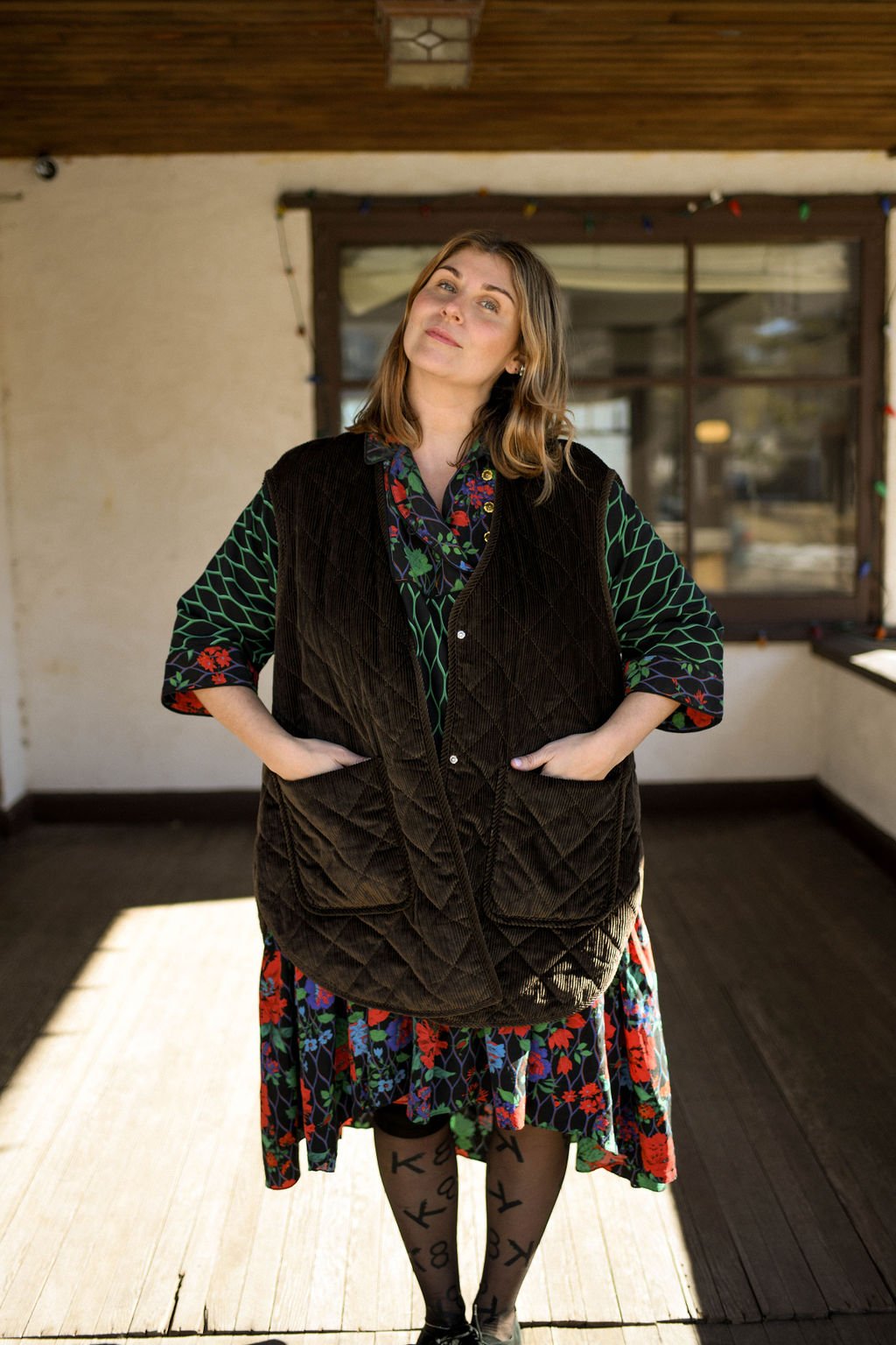 “When I saw this shirt at a secondhand shop, I literally gasped. I love pairing simple jeans with a colorful textured top. When thrifting, I always keep an eye out for vintage Wranglers, 100% cotton tees, L.L. Bean or Lands’ End, and vintage Norma Kamali dresses. The men’s section is usually full of gems, too, and I look outside my standard clothing size because vintage sizing is all over the map.”
