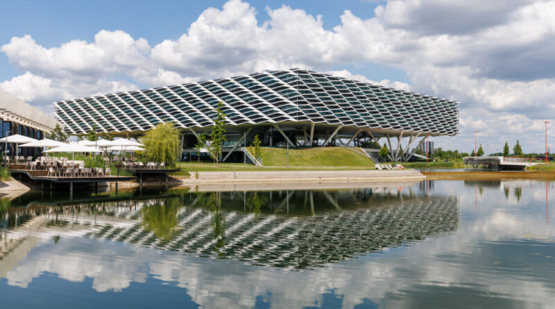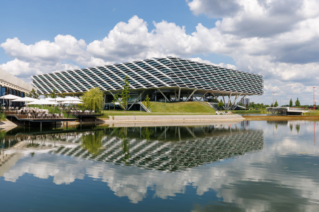 The “Arena” office building at the headquarters of the sporting goods manufacturer adidas AG is reflected in an artificial lake.