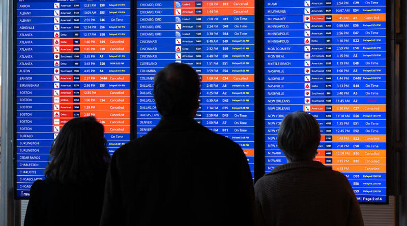 Travelers look at a flight status board as flights are delayed and cancelled following a significant winter storm at Ronald Reagan Washington National Airport in Arlington, Virginia, January 26, 2026.