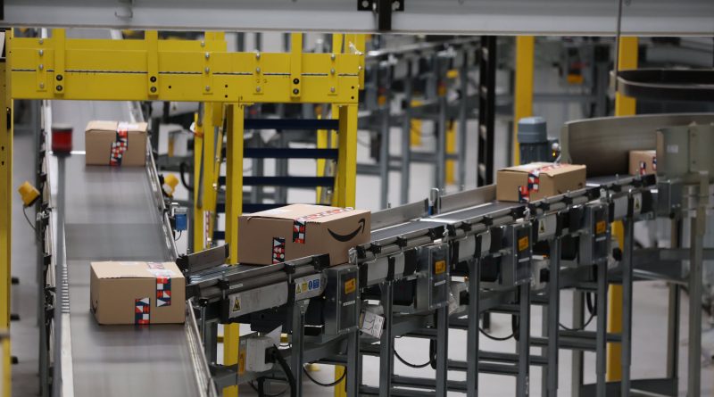 Amazon packages move on a conveyer belt at a fulfillment center in England.