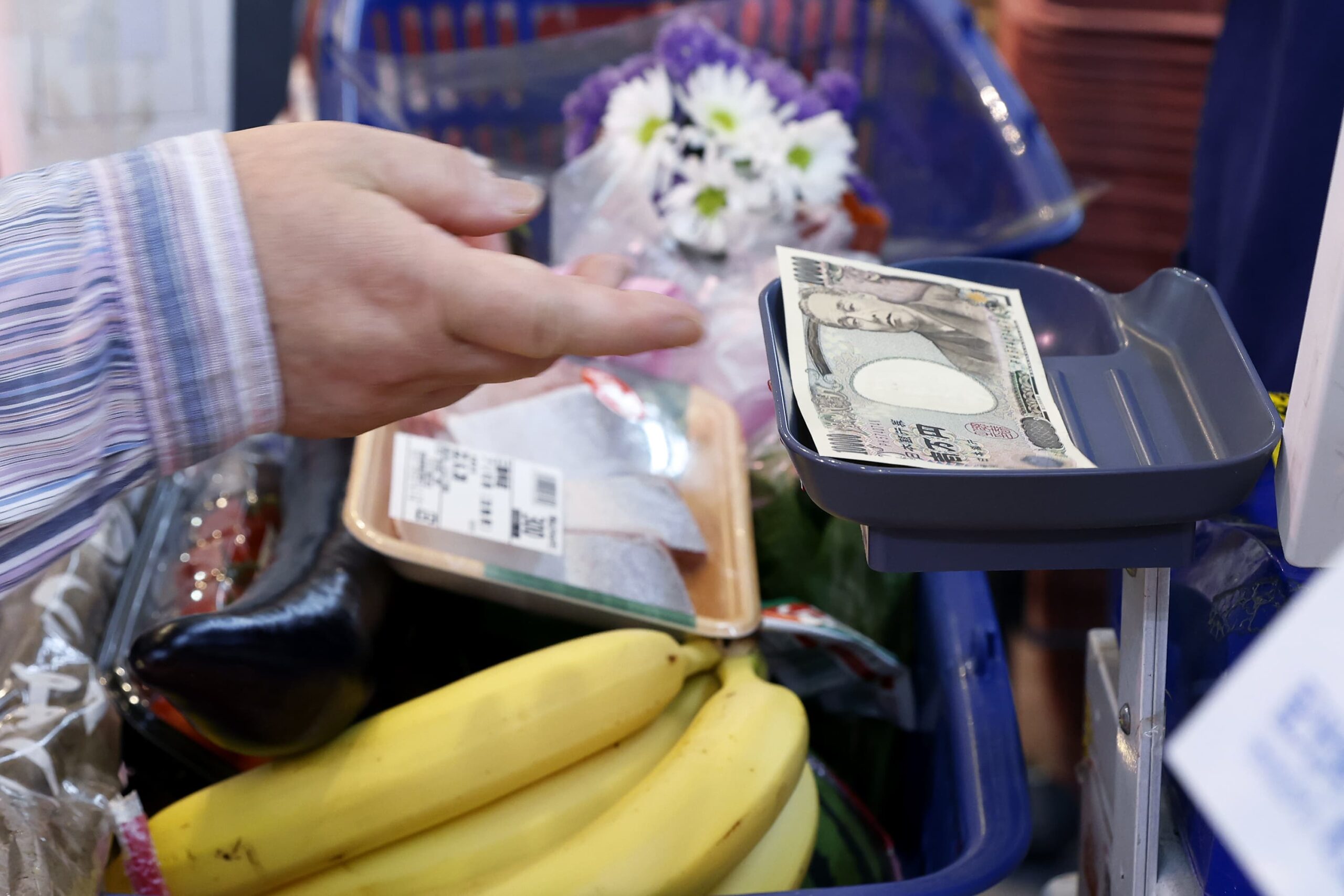 A customer places a Japanese 10,000 yen banknote on a checkout counter while making a purchase at an Akidai YK supermarket in Tokyo, Japan, on Monday, June 27, 2022.