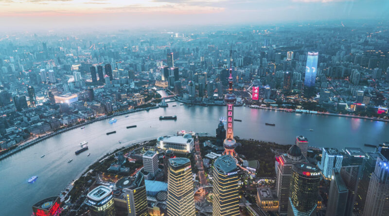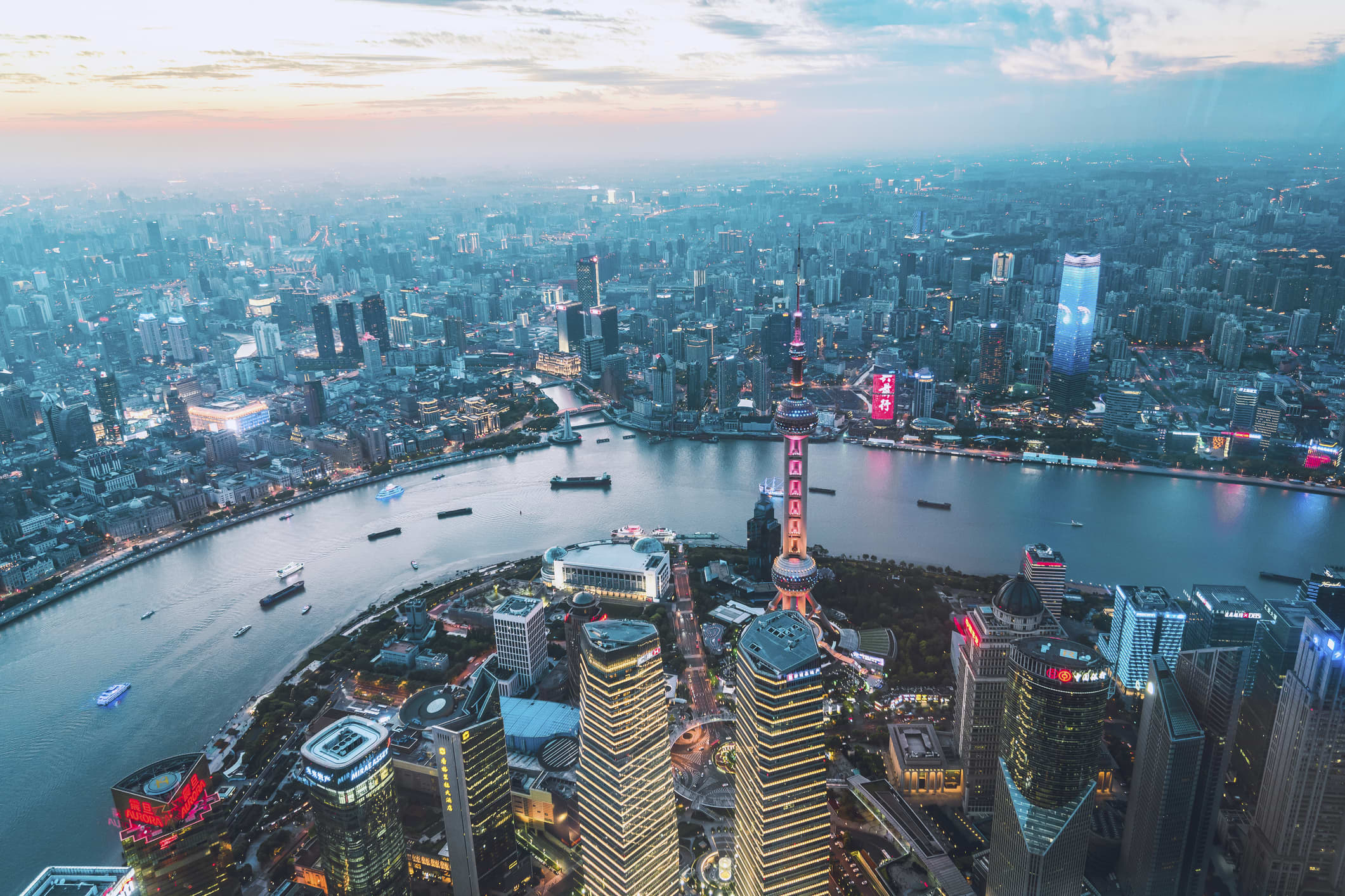Aerial view of the Shanghai financial district skyscrapers and the Huangpu river at sunset.