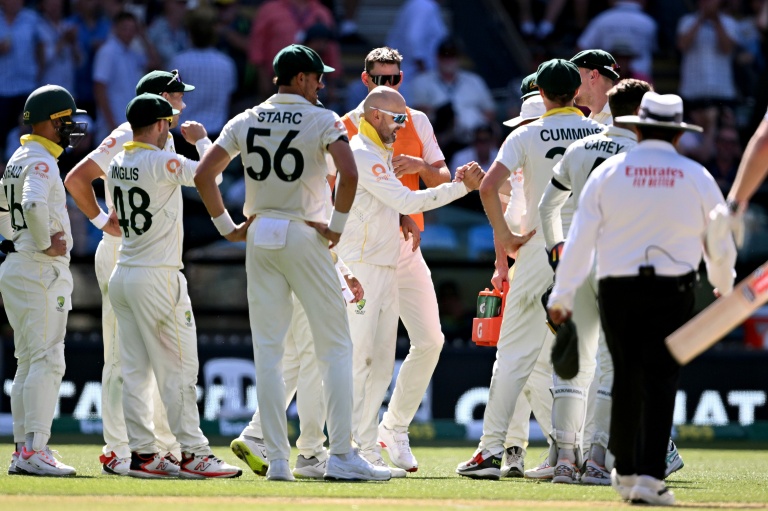 With the pitch deteriorating, Lyon unleashed another trademark delivery to bowl Stokes, then tempted Crawley down the wicket to be stumped by Carey, leaving England’s Ashes campaign in tatters.