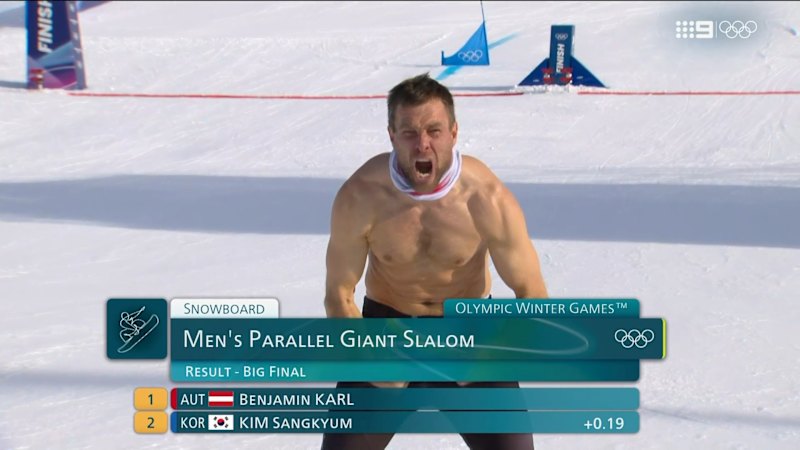 Benjamin Karl rushes to celebrate after his men’s parallel giant slalom win against Kim Sangkyum.Source – Theage