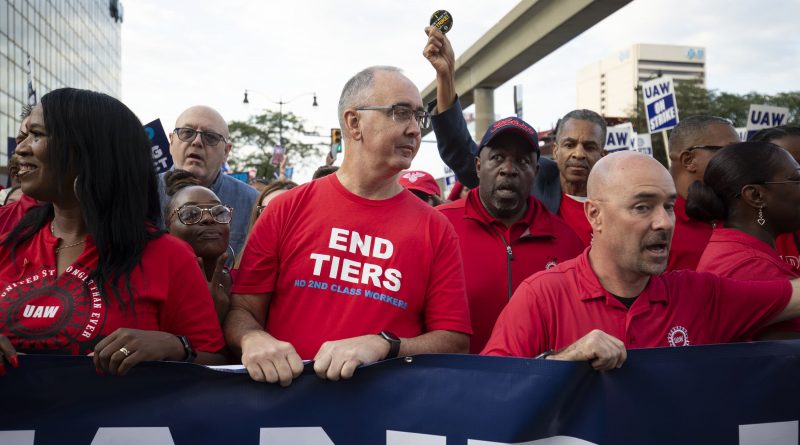 United Auto Workers President Shawn Fain (center) marches with UAW members through downtown Detroit after a rally in support of the union’s members as they strike the Big Three automakers, Detroit, Michigan, Sept. 15, 2023.