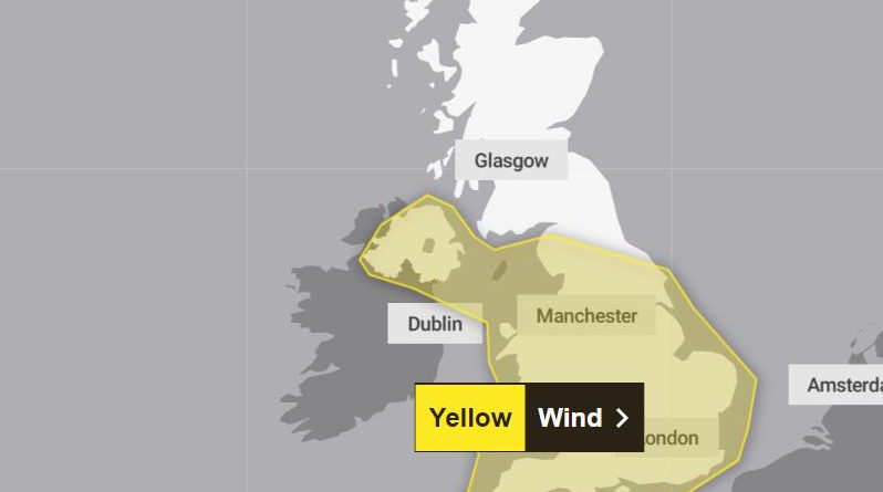 The warning covers all of the south of England, Wales, Northern Ireland and above the North West to just below Carlisle and Middlesbrough.