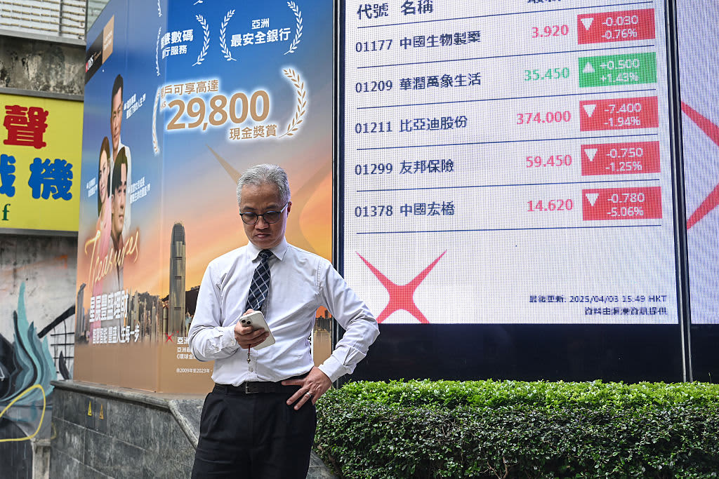 A man checks his phone next to an electronic board showing stocks on the Heng Seng Index in Hong Kong on April 3, 2025.