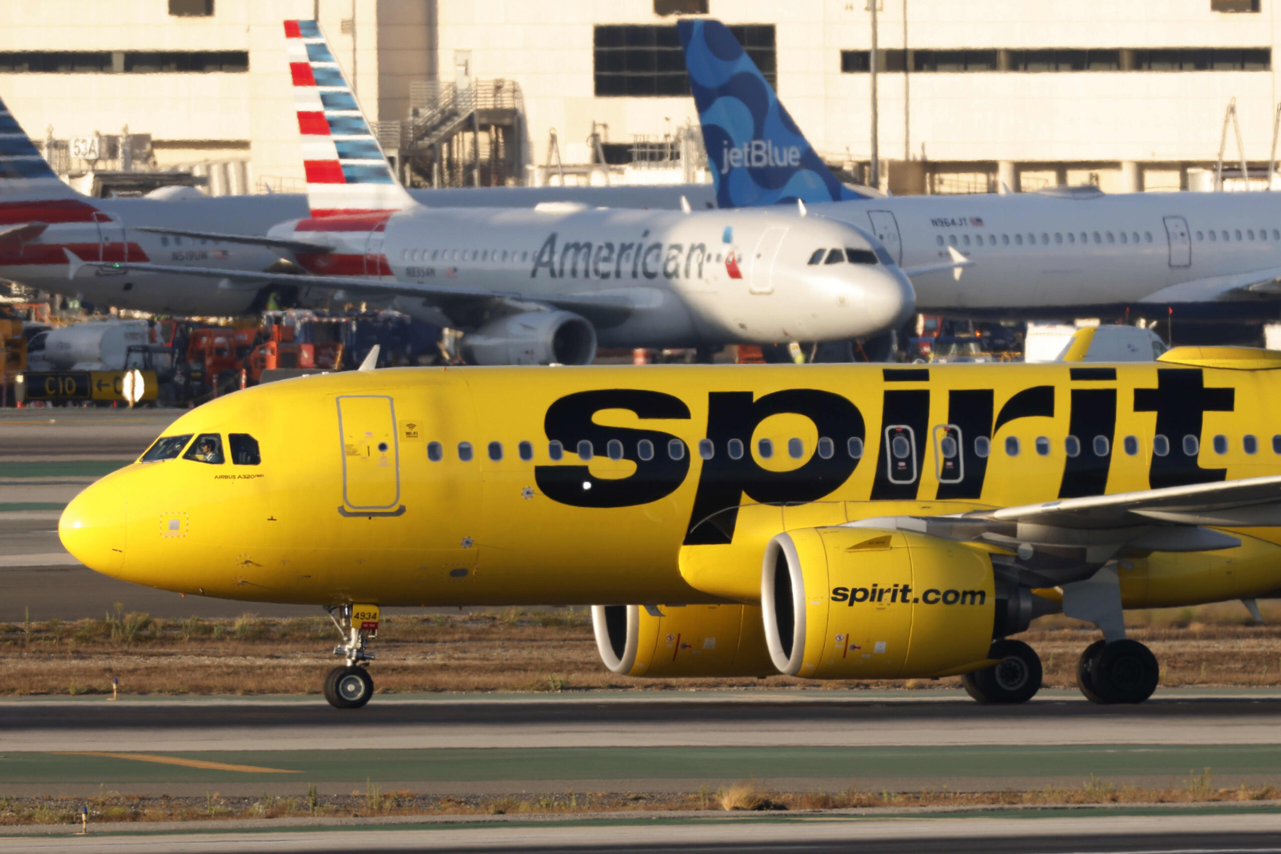 A Spirit Airlines Airbus A320 taxis at Los Angeles International Airport after arriving from Boston on Sept. 1, 2024.