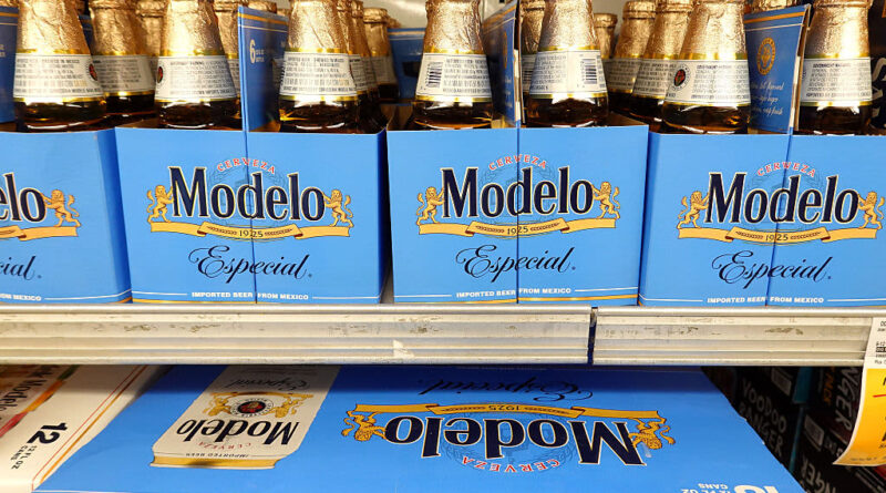 Modelo beer is displayed on a shelf at a Safeway store on Oct. 6, 2025 in San Anselmo, California.