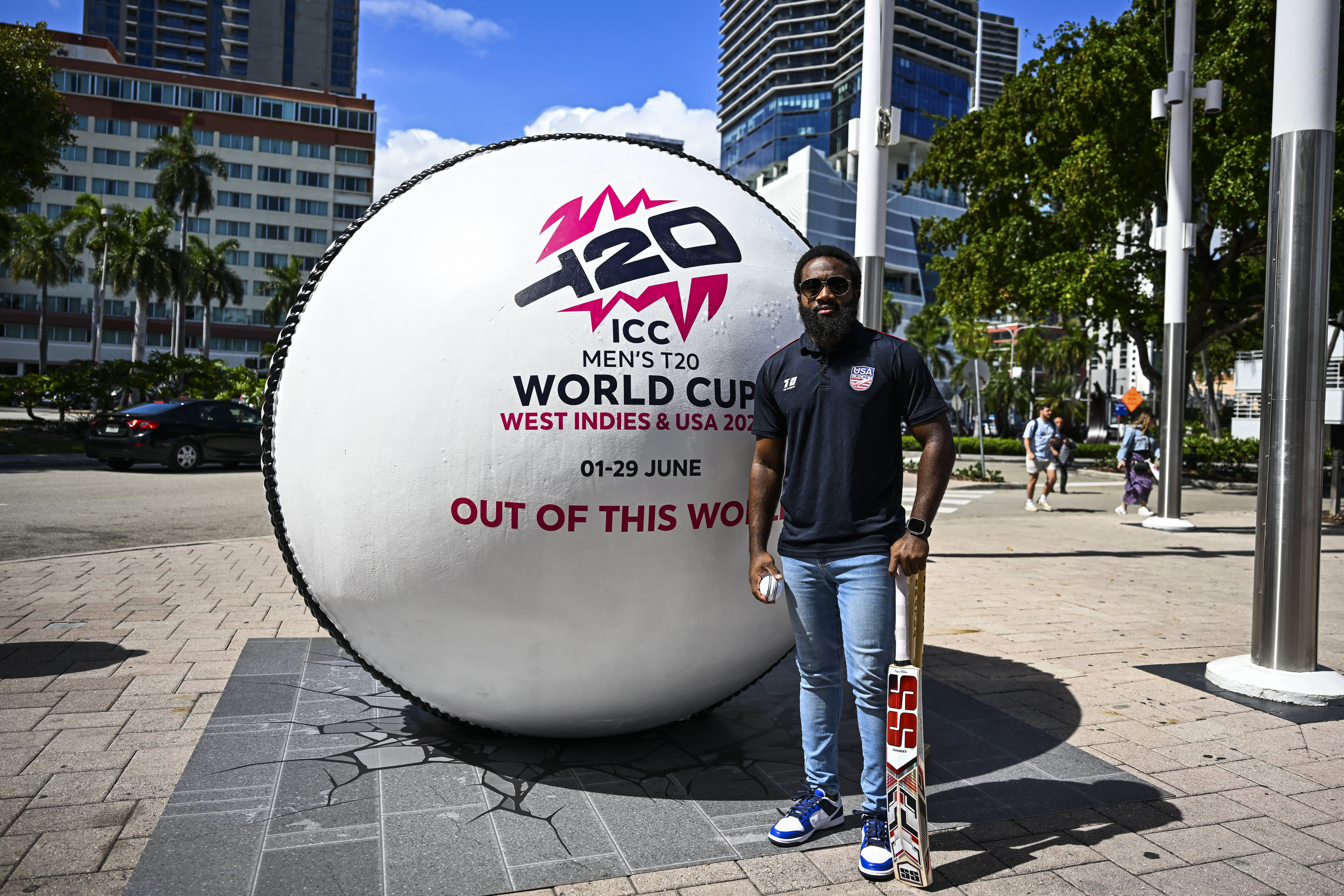 USA Cricket Vice-Captain Aaron Jones poses next to a giant cricket ball, installed at a marketplace to mark 100 days to go for the ICC Men’s T20 World Cup, in Miami, Florida, on Feb. 22, 2024.