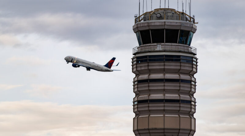 A Delta Airlines plane takes off near the air traffic control tower at Ronald Reagan Washington National Airport (DCA) in Arlington, Virginia, US, on Tuesday, Oct. 28, 2025.