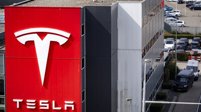 A photo shows the logo on US electric carmaker Tesla’s European headquarters in Amsterdam on May 2, 2025.