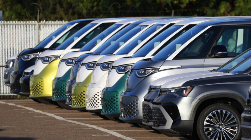 Rows of Volkswagen ID Buzz electric buses are parked at the National City Marine Terminal, a major port for vehicle imports and exports to the U.S.
