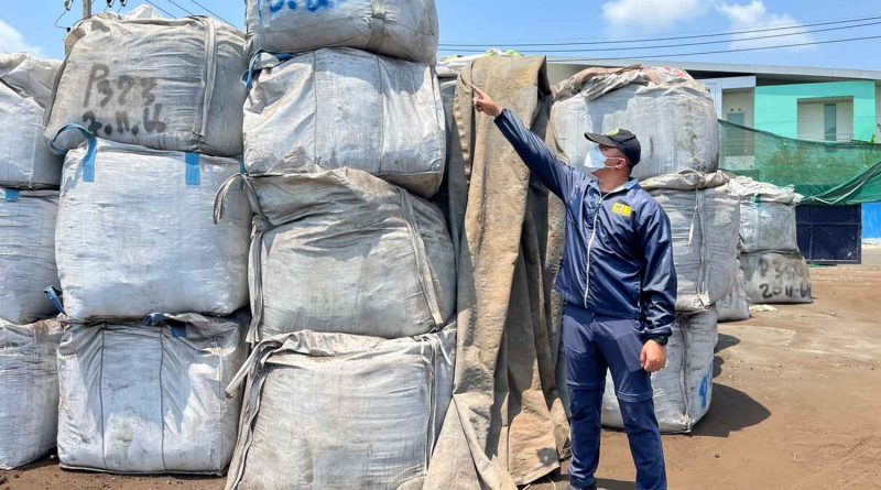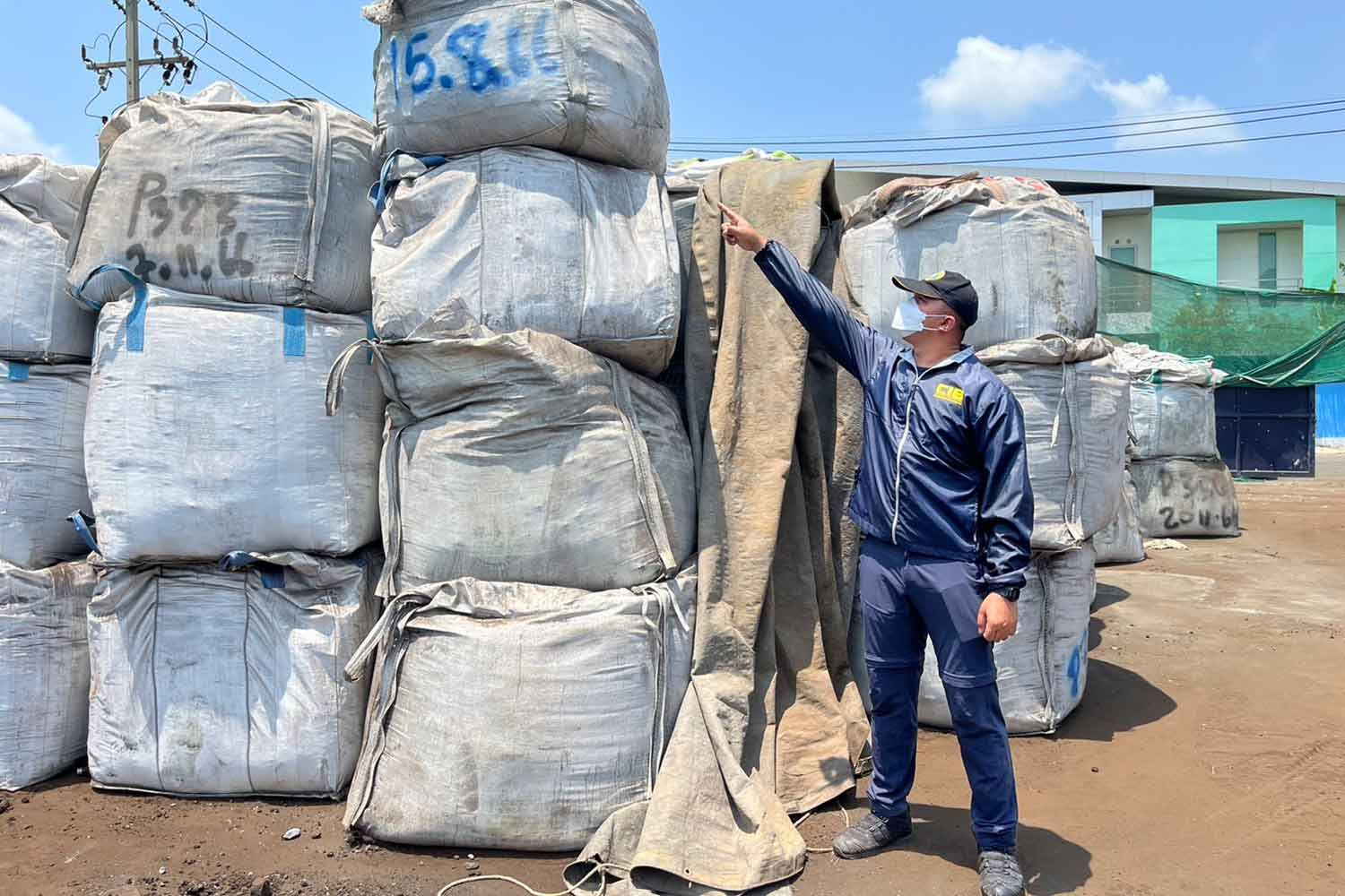 A police officer shows bags containing cadmium waste found at a warehouse in Muang district of Samut Sakhon on Sunday. (Police photo)