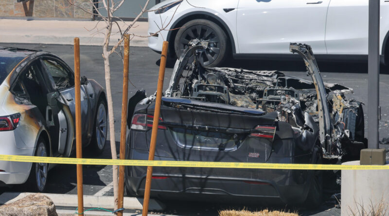 Burned Teslas are shown at a Tesla Collision Center after an individual used incendiary devices to set several vehicles on fire on March 18, 2025 in Las Vegas, Nevada.