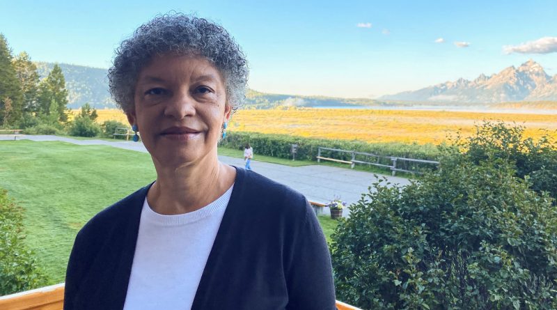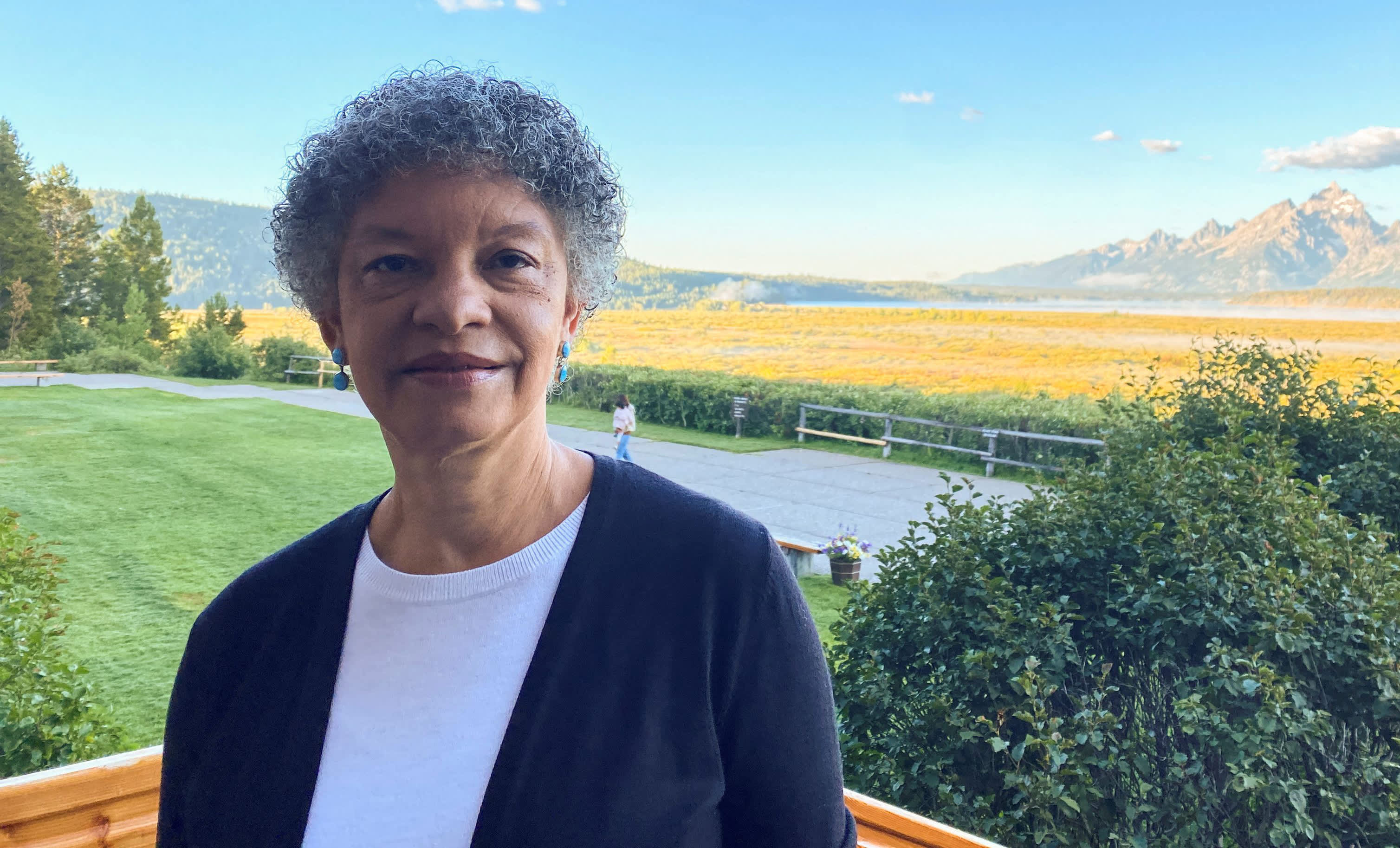 Federal Reserve Bank of Boston President Susan Collins stands behind the Jackson Lake Lodge in Jackson Hole, where the Kansas City Fed holds its annual economic symposium, in Wyoming, August 24, 2023.