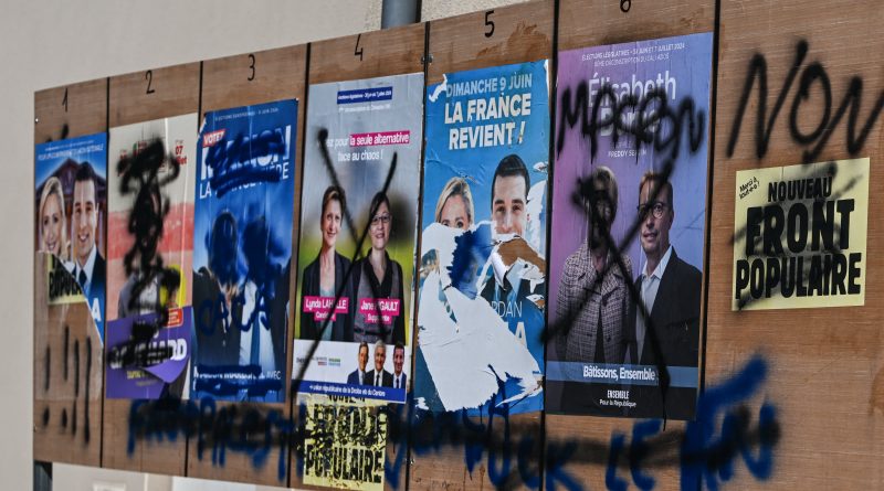 Vandalized posters with images of local candidates for the European Parliament election mixed with those from the first round of the 2024 French legislative elections, seen on June 24 2024, in Val d Arry, Calvados. France will hold an early legislative election in two rounds on June 30 and July 7 2024, following President Emmanuel Macrons decision which was triggered by his party’s heavy defeat to the far-right National Rally in the 2024 European Parliament election.