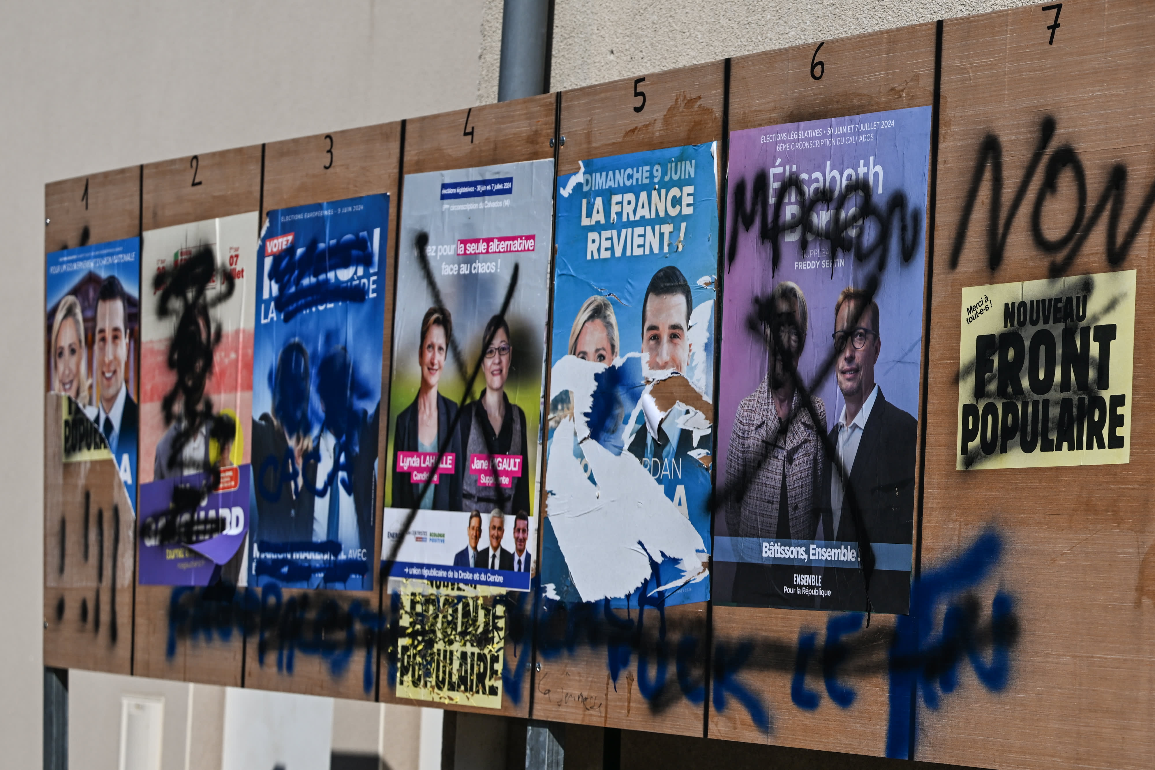 Vandalized posters with images of local candidates for the European Parliament election mixed with those from the first round of the 2024 French legislative elections, seen on June 24 2024, in Val d Arry, Calvados. France will hold an early legislative election in two rounds on June 30 and July 7 2024, following President Emmanuel Macrons decision which was triggered by his party’s heavy defeat to the far-right National Rally in the 2024 European Parliament election.