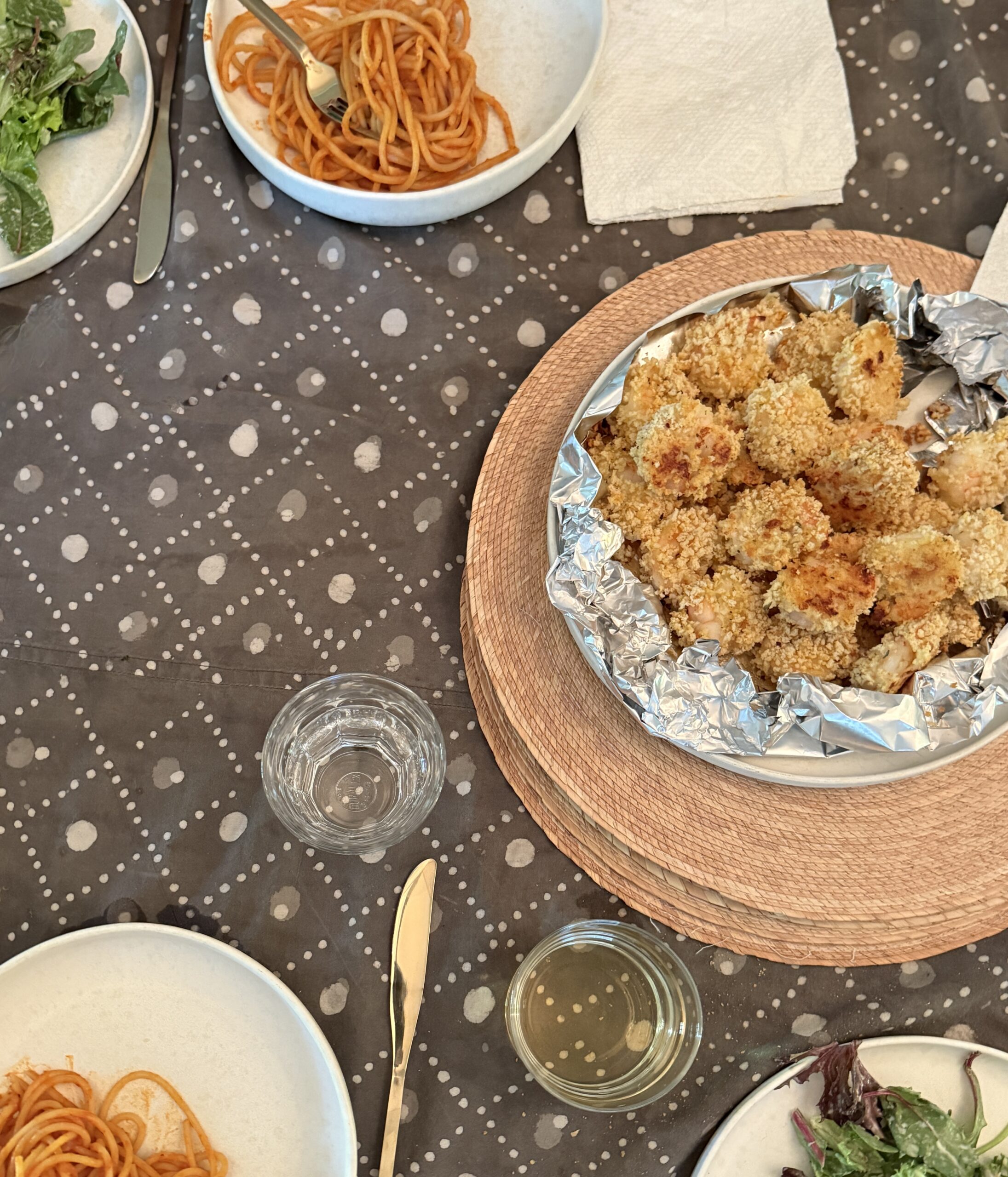 Serve with pasta with tomato sauce and green salad, if you’d like. You can eat the shrimp with the pasta or separately — breaded shrimp and red sauce can be so, so good. Enjoy!