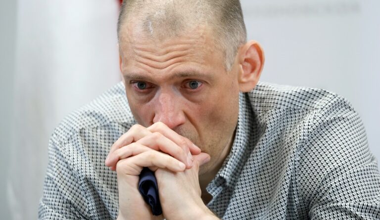 A tearful and emaciated Tikhanovsky spoke to reporters in the Lithuanian capital Vilnius a day after he was released from several years of prison with more than a dozen others.