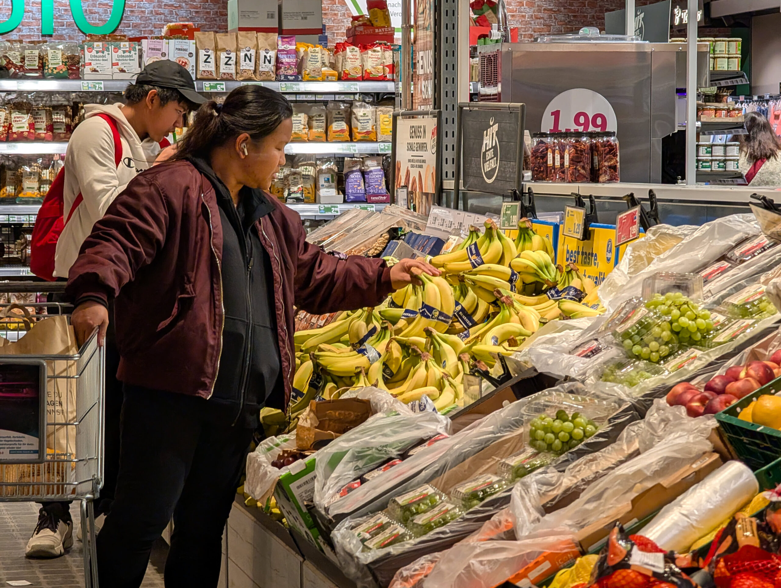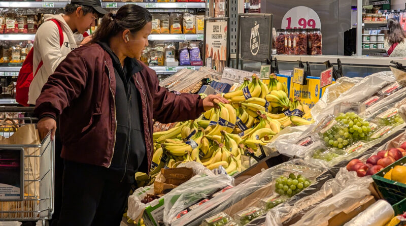 Customers shop for fresh fruits and vegetables in a supermarket in Munich, Germany, on March 8, 2025.