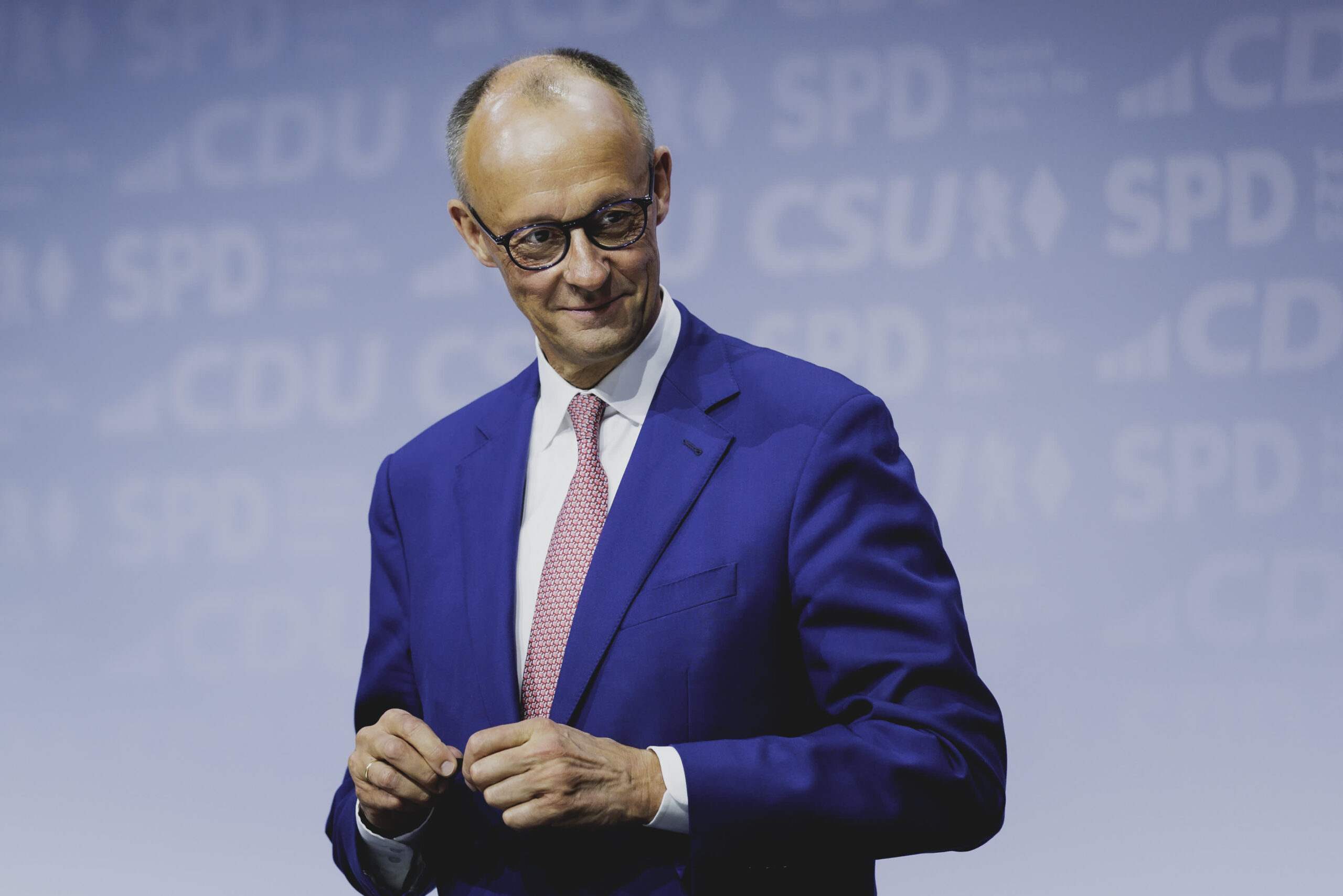 Friedrich Merz, designated Federal Chancellor (CDU), is pictured during the signing of the coalition agreement between the SPD, CDU, and CSU on May 05, 2025 in Berlin, Germany.