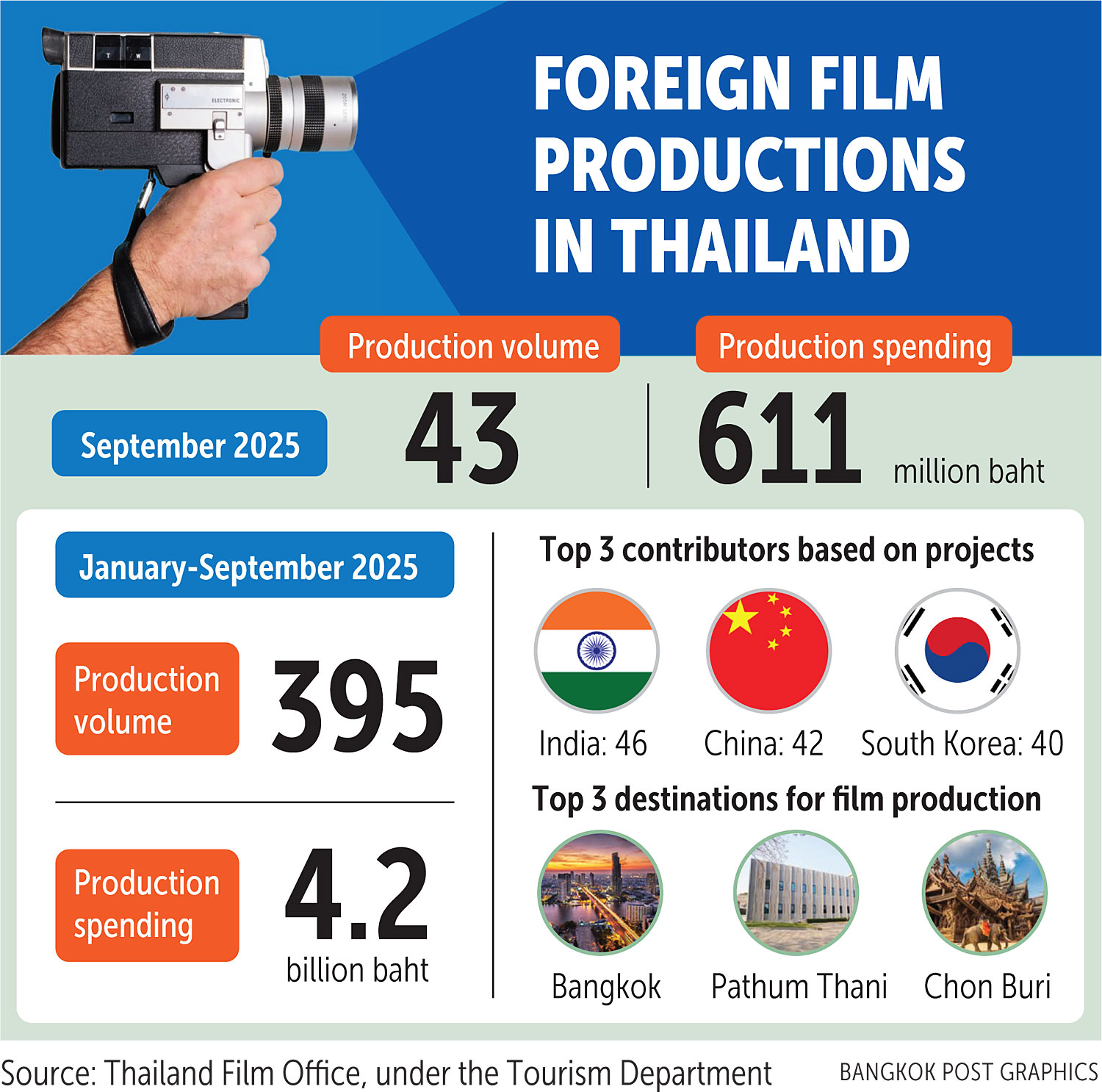 From January to September 2025, Thailand welcomed 395 international film productions with production spending worth roughly 4.2 billion baht, according to the Thailand Film Office, under the Ministry of Tourism and Sports’ Department of Tourism.