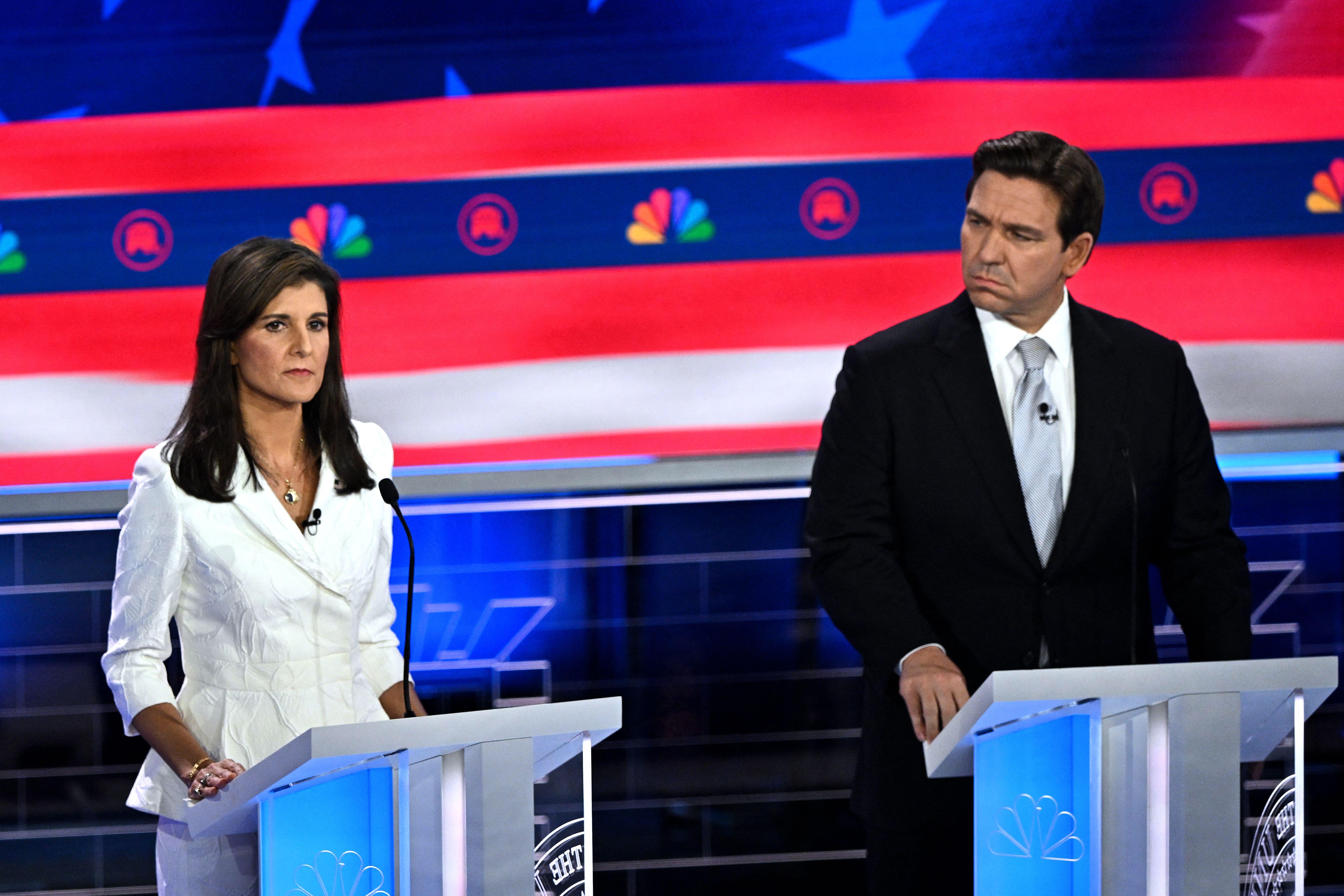 Former Governor from South Carolina and UN ambassador Nikki Haley (L) and Florida Governor Ron DeSantis attend the third Republican presidential primary debate at the Knight Concert Hall at the Adrienne Arsht Center for the Performing Arts in Miami, Florida, on November 8, 2023.