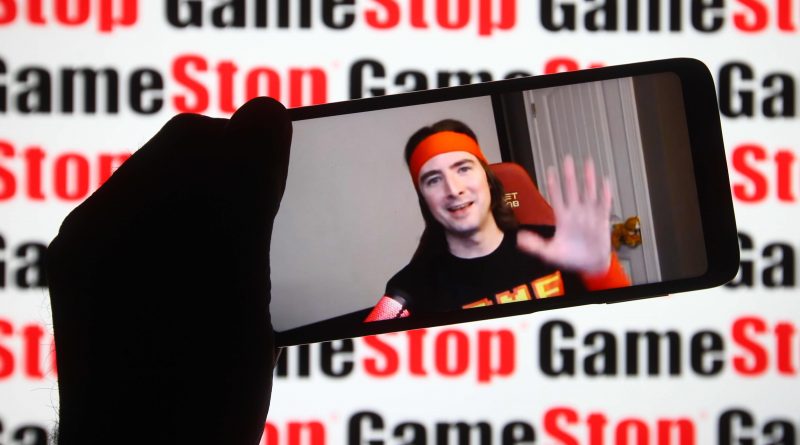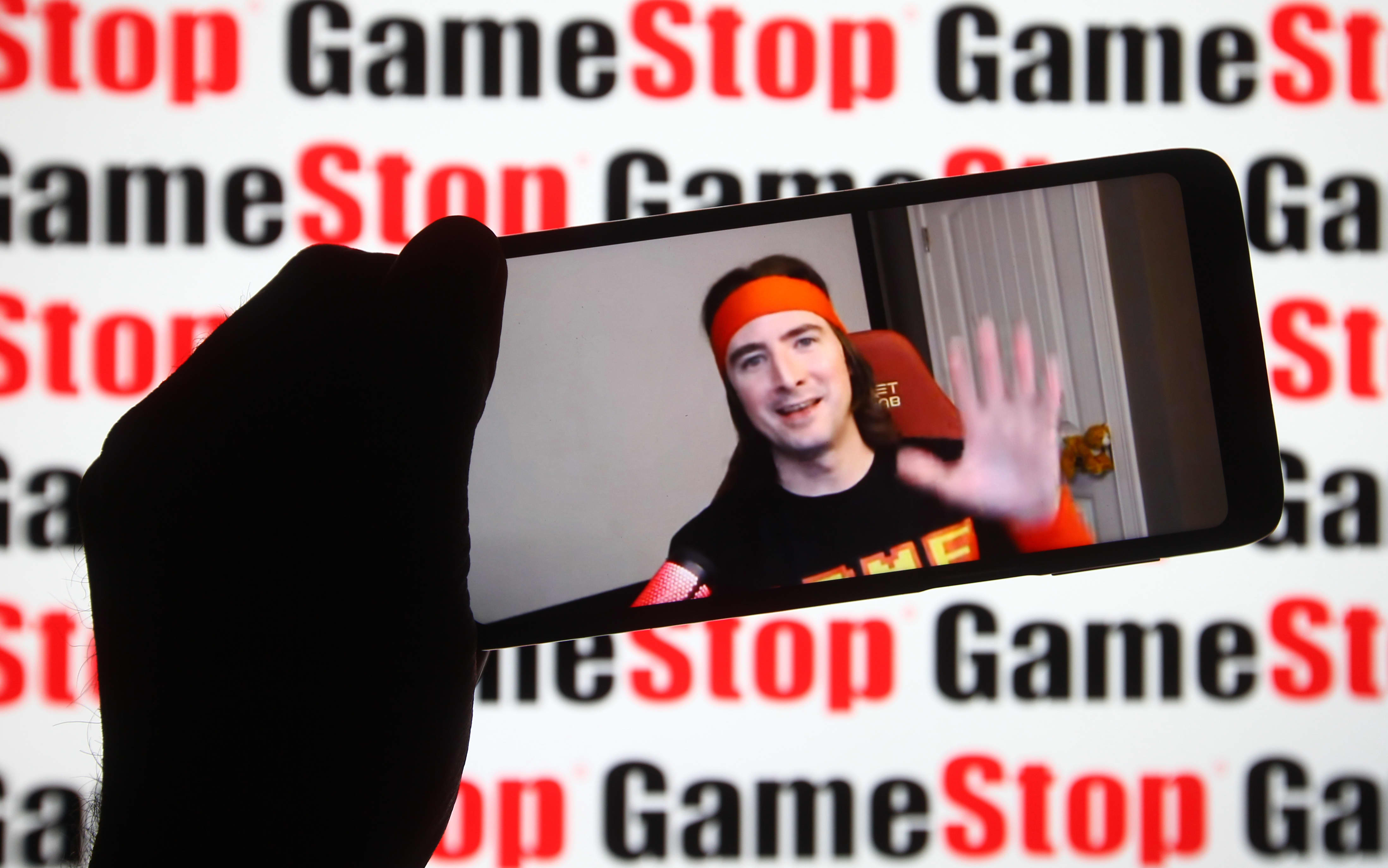 Keith Gill, known on Reddit under the pseudonym DeepF——-Value and as Roaring Kitty, is seen on a fragment of a youtube video displayed on a smartphone screen in front of GameStop logo.