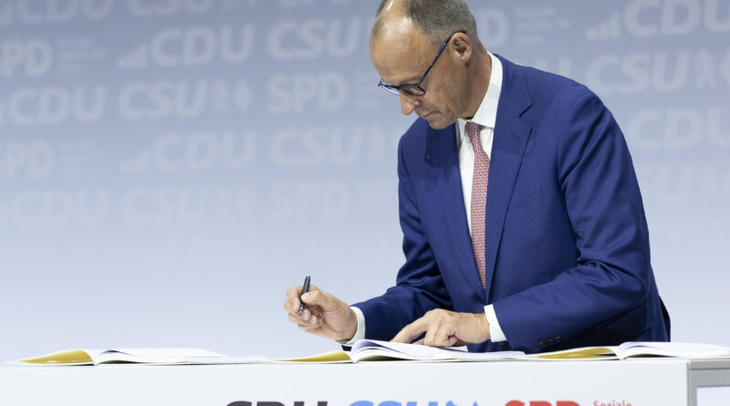 Friedrich Merz, leader of the Christian Democratic Union (CDU), signs the coalition contract between the CDU, the CDU’S Bavarian sister party, the Christian Social Union (CSU), and the German Social Democrats (SPD) on May 05, 2025 in Berlin, Germany.