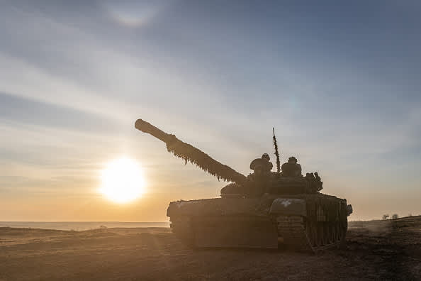 Ukrainian soldiers drive a tank during a military training at an undetermined location.