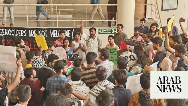 JNUSU President Dhananjay told Arab News: “By calling such a person in the university … who is supporting the genocide, we want to tell them that JNU is not silent on this issue and we want to speak up.