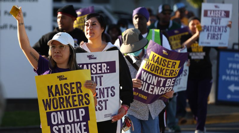 Striking Kaiser Permanente workers hold signs as they march in front of the Kaiser Permanente Vallejo Medical Center on October 06, 2023 in Vallejo, California.