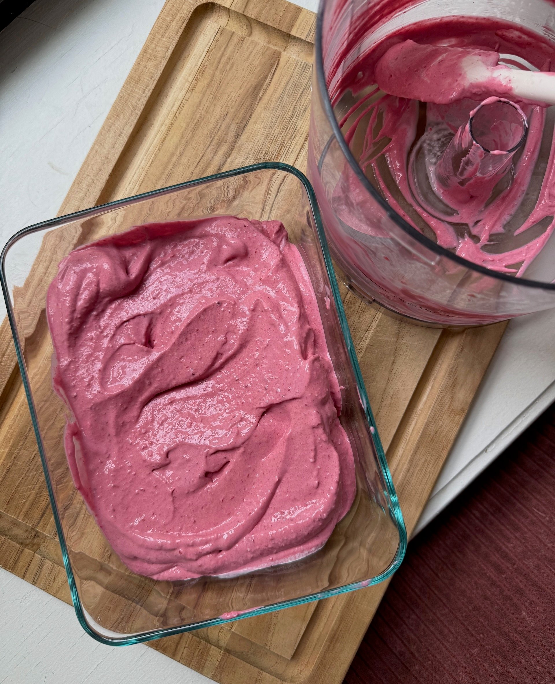 Note: In my experience, this works best with frozen raspberries, blackberries, or mango — but work with what you have. The key is to start by dumping in all the fruit, then adding a little cream and condensed milk at a time.