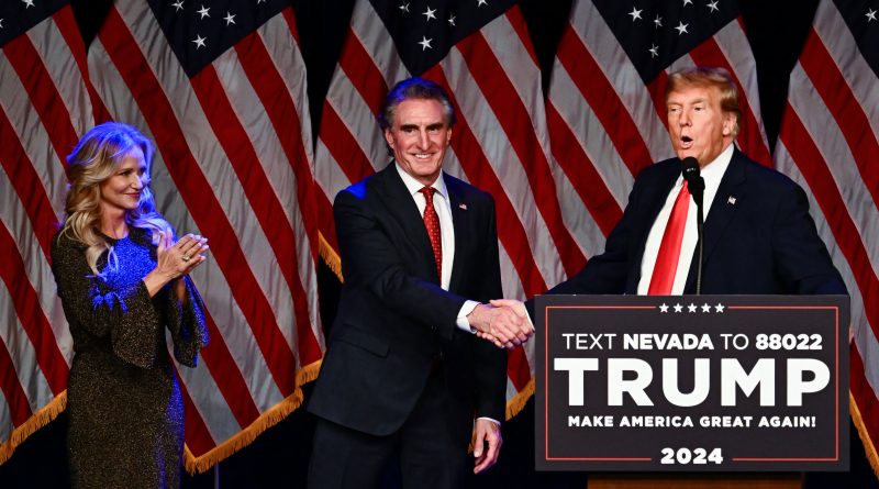 Kathryn Burgum aplauds as her husband Republican Governor of North Dakota Doug Burgum shakes hands with former US President and 2024 presidential hopeful Donald Trump during a Caucus Night watch party in Las Vegas, Nevada, on February 8, 2024.