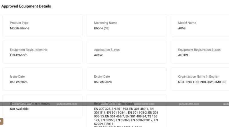 First spotted by Xpertpick, Nothing Phone 3a is now listed on the UAE’s Telecommunications And Digital Government Regulatory Authority (TDRA) certification website bearing the model number A059. It is a mandatory requirement for Radio and Telecommunications Terminal Equipment (RTTE) to comply with specific technical standards before they can be used, sold or distributed in the UAE.