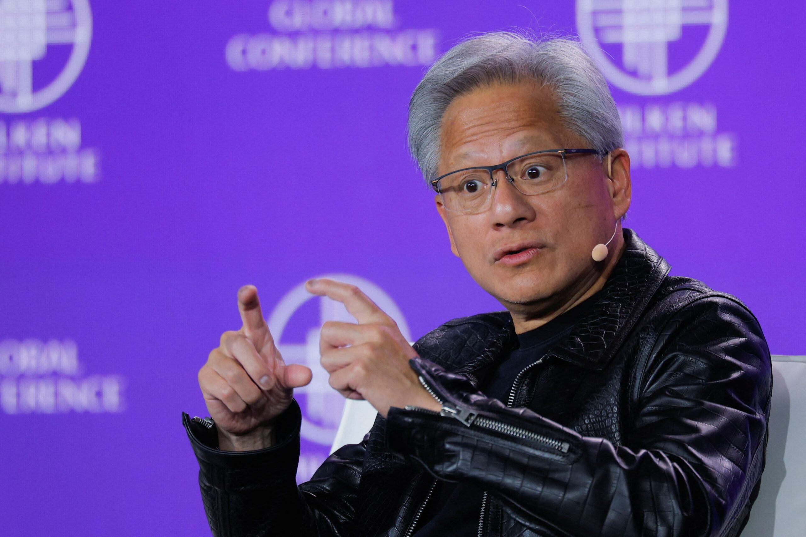 Founder and CEO at Nvidia Jensen Huang is interviewed by Chairman of the Milken Institute Michael Milken (not pictured) during the Milken Institute Global Conference 2025 in Beverly Hills, California, U.S., May 5, 2025.