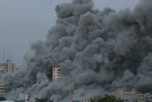 Israeli occupation fighters attack 10-story Palestine residential building in the middle of Gaza City, levelling it to the ground.