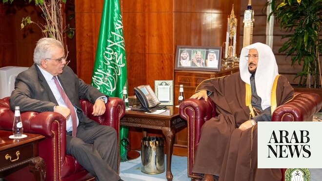 RIYADH: Saudi Minister of Islamic Affairs Abdullatif bin Abdulaziz Al-Sheikh received the newly appointed Palestinian Ambassador to the Kingdom Mazen Ghoneim in his office on Monday in Riyadh, the Saudi Press Agency reported.