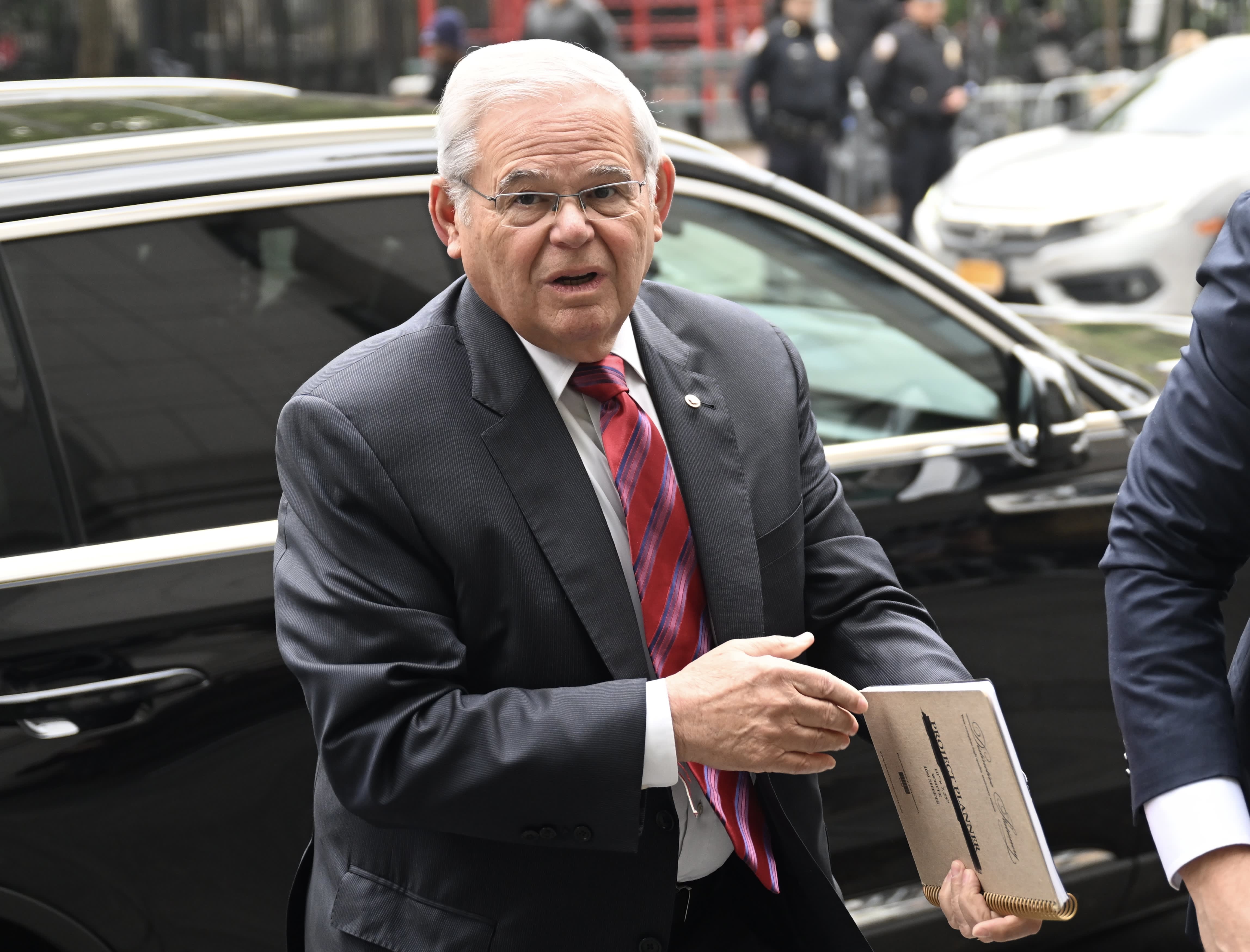 Menendez, 70, wearing a dark suit and striped red tie with his gold senator’s pin on his lapel, listened silently in the courtroom.