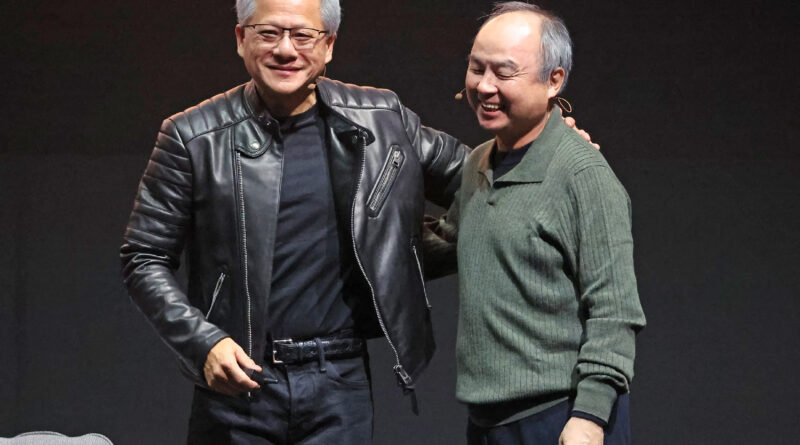 Nvidia CEO Jensen Huang (L) and the CEO of the SoftBank Group Masayoshi Son pose during an AI event in Tokyo on November 13, 2024.
