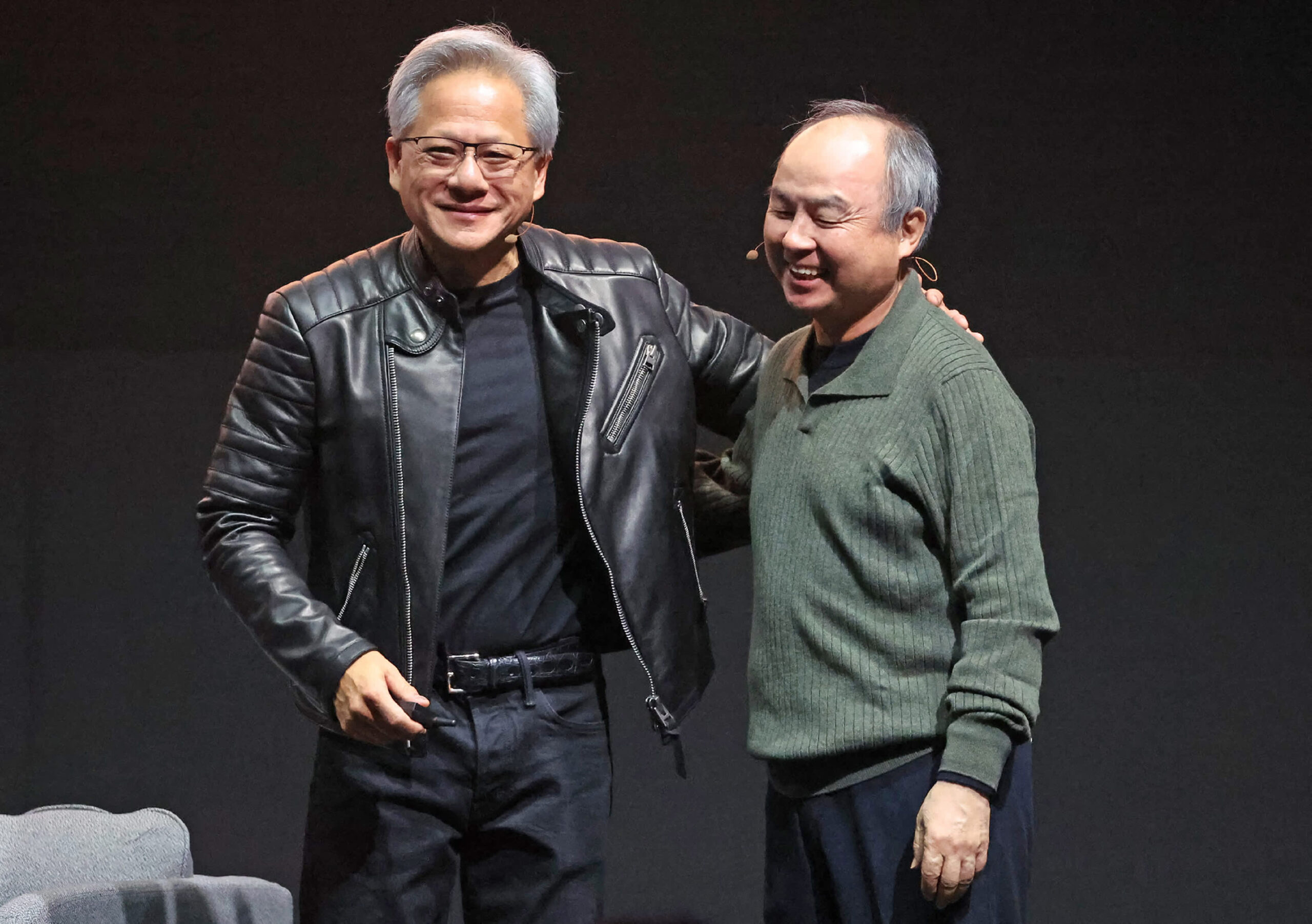 Nvidia CEO Jensen Huang (L) and the CEO of the SoftBank Group Masayoshi Son pose during an AI event in Tokyo on November 13, 2024.