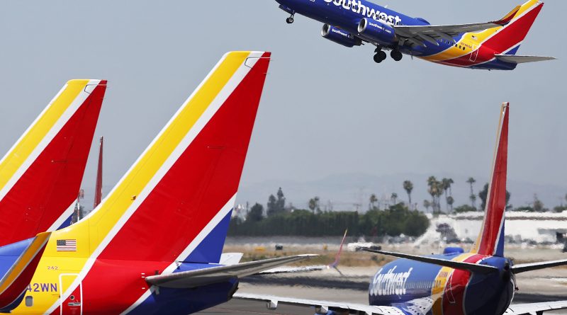 A Southwest Airlines plane takes off from Hollywood Burbank Airport above other Southwest planes on July 25, 2024 in Burbank, California.